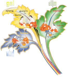 De drie bladeren staan voor drie fundamentele krachten in het lichaam. In de Tibetaanse geneeskunde zijn dat: